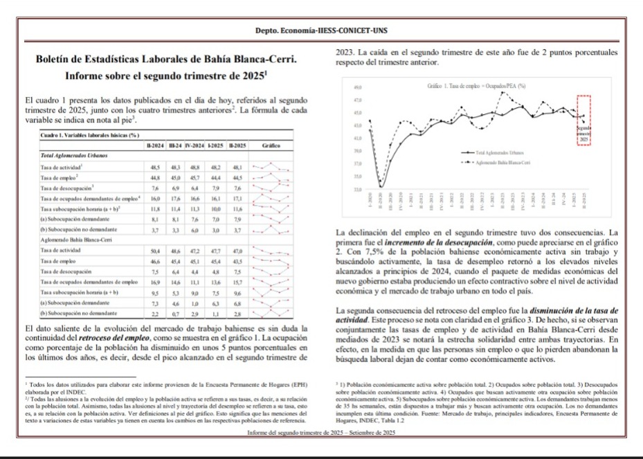 Según el último Boletín de Estadísticas Laborales del segundo trimestre de 2025, el mercado de trabajo de Bahía Bahía-Cerri muestra una caída de la tasa de empleo de 3 puntos porcentuales en el último año y suba de la tasa de desocupación.