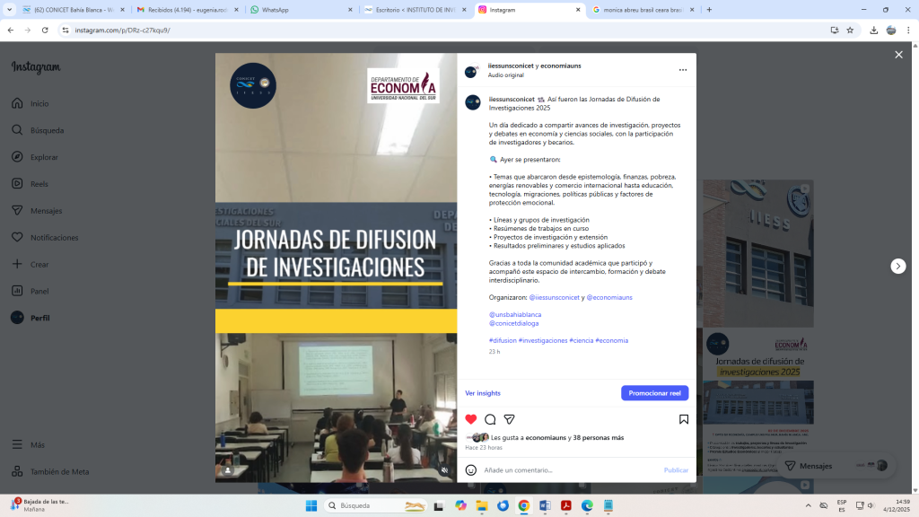 El 02 de diciembre se realizaron las Jornadas de Difusión de Investigaciones 2025. Un día dedicado a compartir avances de investigación, proyectos y debates en economía y ciencias sociales, con la participación de investigadores, becarios y miembros del Instituto de Investigaciones Económicas y Sociales del Sur y del Departamento de Economía de la UNS. Se presentaron: • Temas que abarcaron desde epistemología, finanzas, pobreza, energías renovables y comercio internacional hasta educación, tecnología, migraciones, políticas públicas y factores de protección emocional. • Líneas y grupos de investigación • Resúmenes de trabajos en curso • Proyectos de investigación y extensión • Resultados preliminares y estudios aplicados